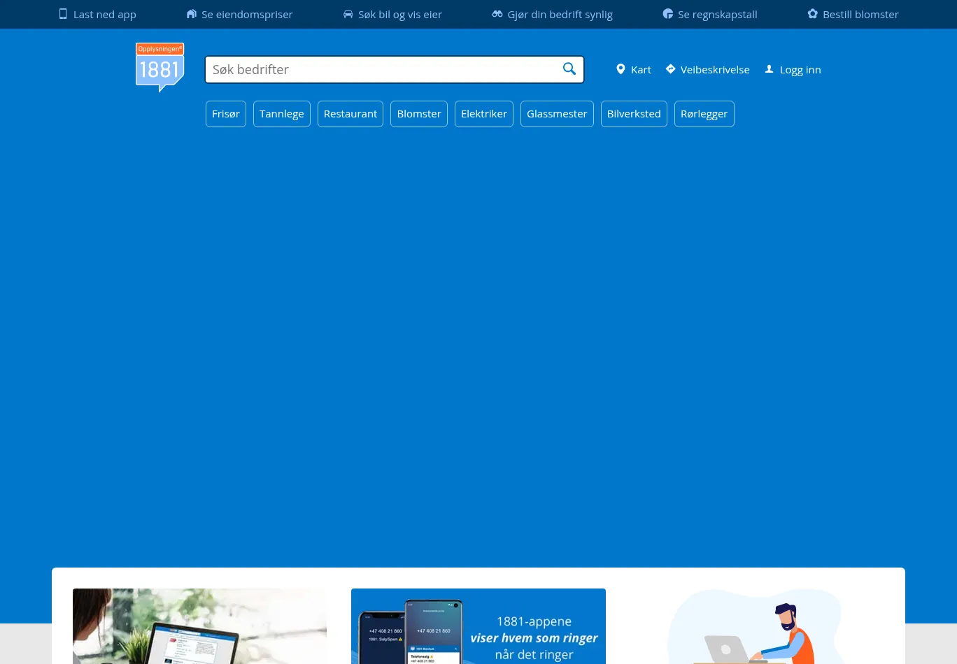 | Description: Opplysningen 1881® gir deg Norges mest oppdaterte telefonkatalog. Søk etter pålitelig nummeropplysning på personer og bedrifter. Finn det du trenger raskt! |