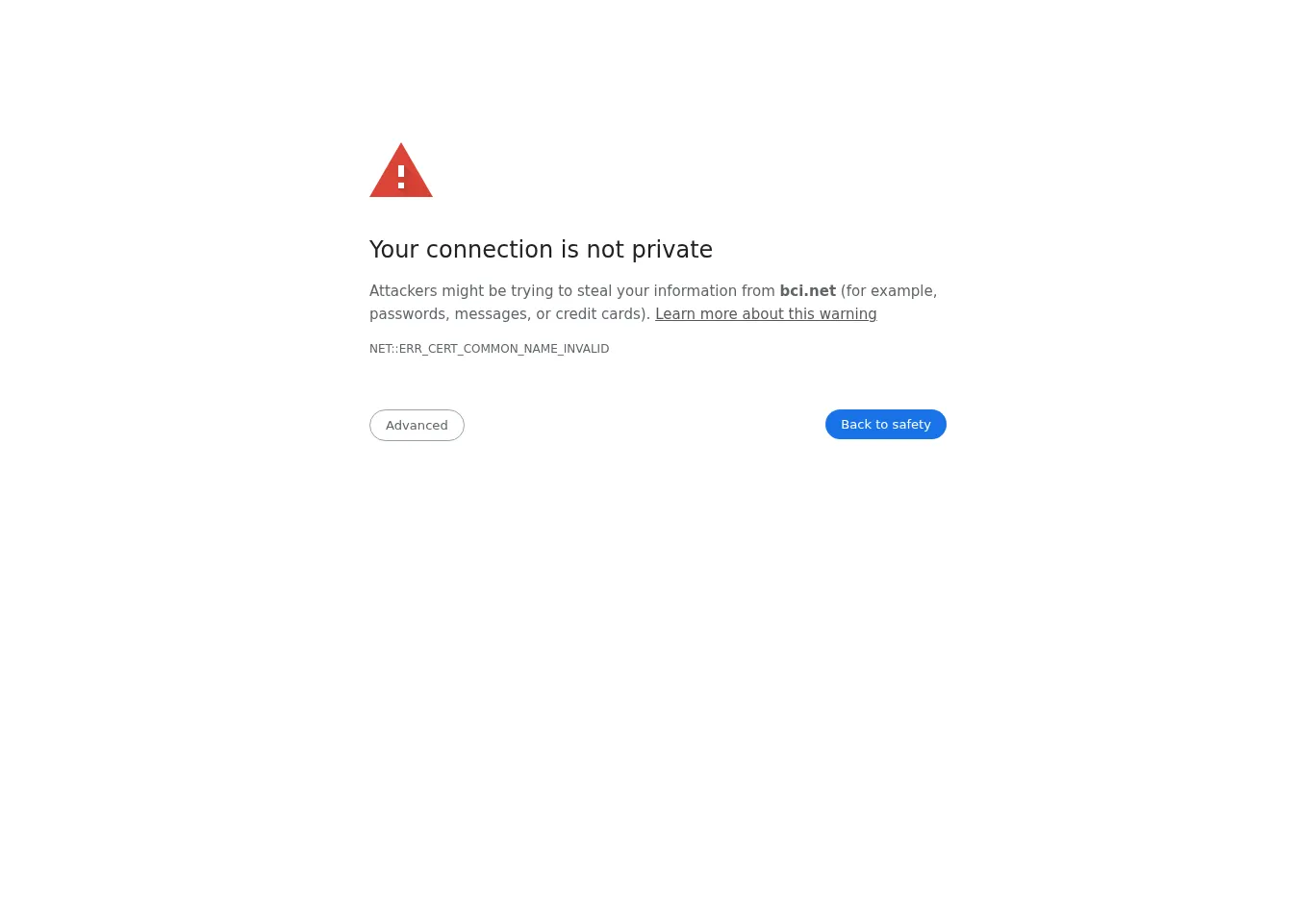 "innerText" : "This server could not prove that it is bci.net; its security certificate is from *.hostingplatform.com. This may be caused by a misconfiguration or an attacker intercepting your connection."