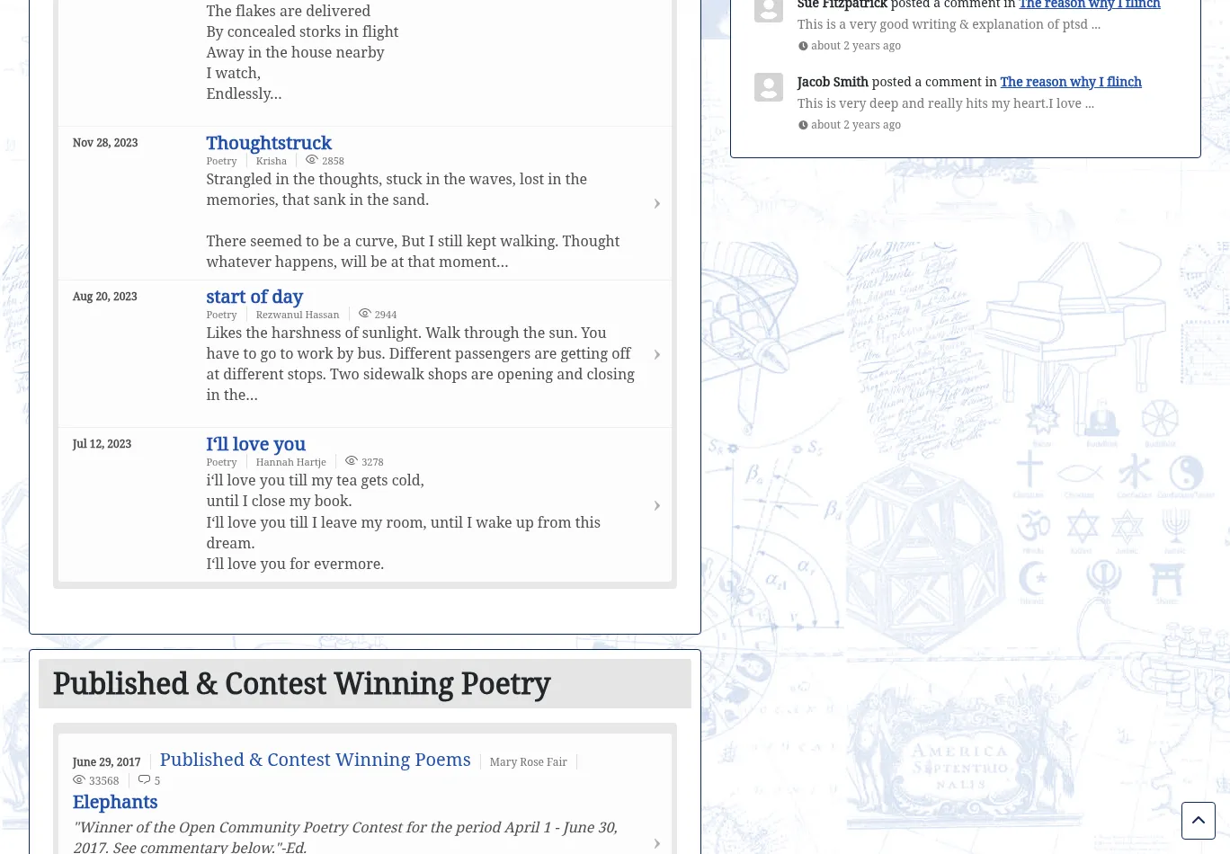 | Top 25 Nouns: poetry contest love winning community interview comment interviews contributor elephants fair june poems staff administrator john mantel mary michael miller observer october period prose reason | |