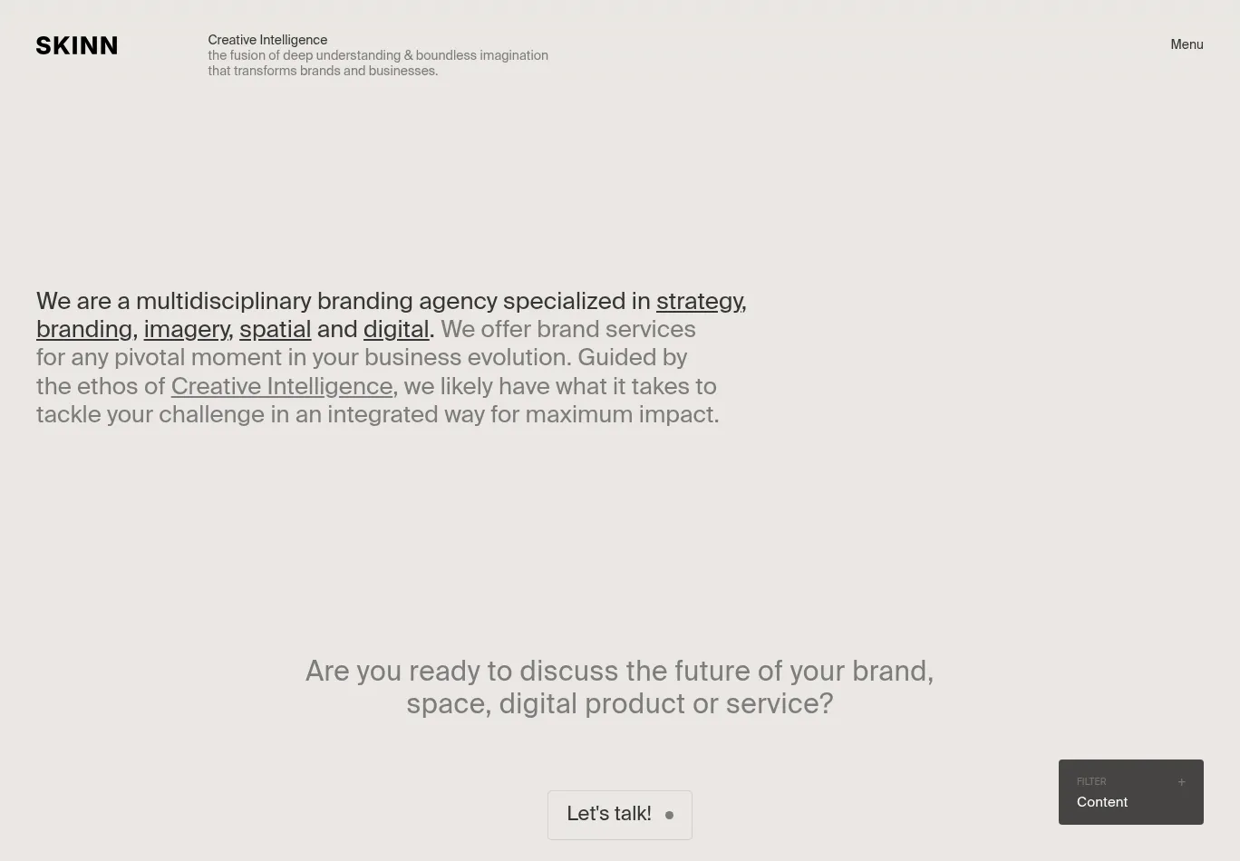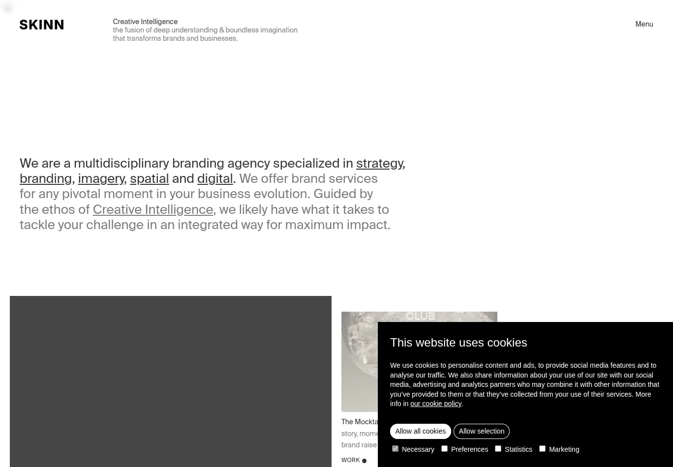 | Description: SKINN branding agency. Specialized in strategy, branding, imagery, spatial and digital. Guided by the ethos of Creative Intelligence. |