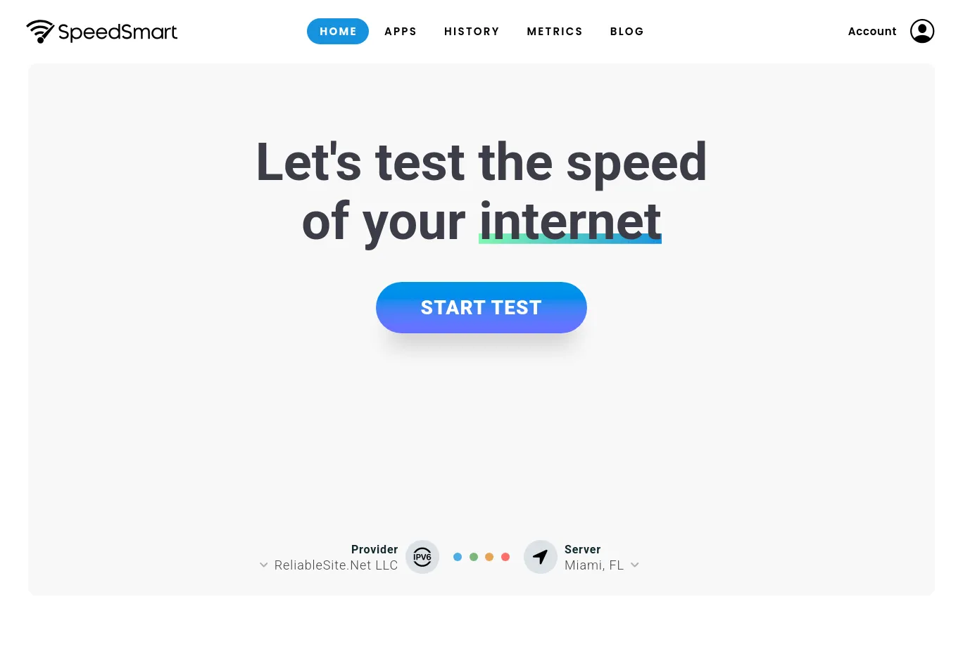 | Description: SpeedSmart.net is an HTML5 Internet speed test. Test your internet connection speed in seconds to locations all around the world with this broadband speed test to see how fast your home or mobile internet connection really is across every device. |