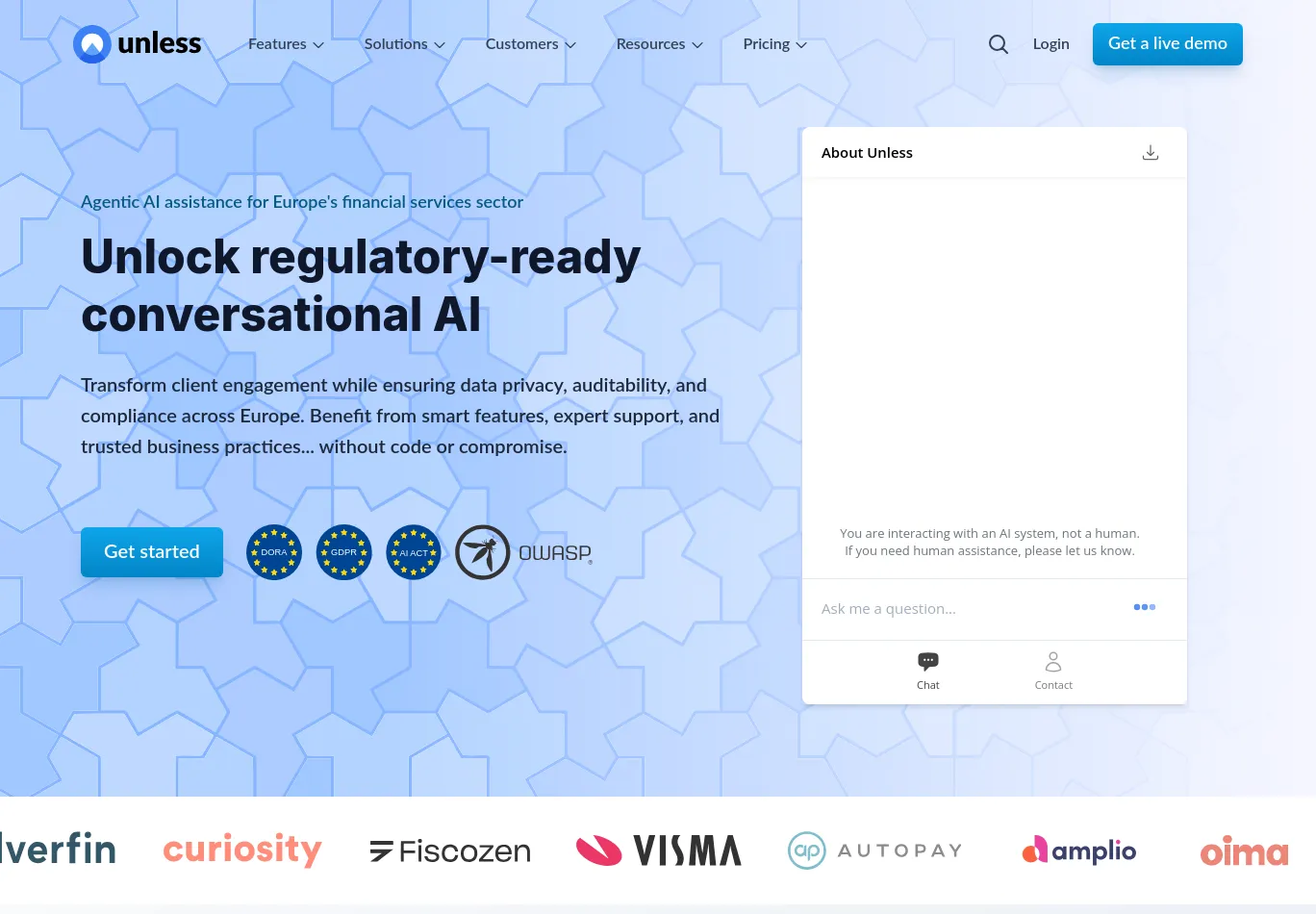 | Description: Discover UNLESS’s AI solutions for enhancing customer support and success in Europe’s regulated sectors. Our privacy-first platform ensures compliance with GDPR and the EU AI Act for financial services and healthcare sectors. |