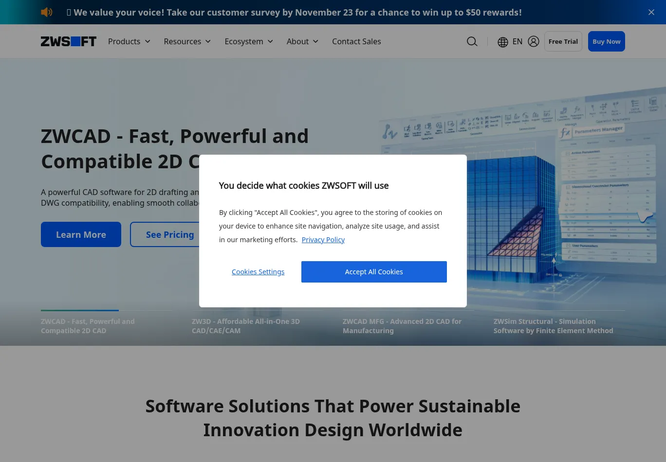 "https://www.facebook.com/tr/?id=987361498483215&ev=PageView&dl=https%3A%2F%2Fwww.zwsoft.com%2F&rl=&if=false&ts=1763547964309&sw=1368&sh=768&v=2.9.242&r=stable&ec=0&o=4126&fbp=fb.1.1763547964303.79160000370065513&eid=ob3_plugin-set_774281830e3f4acacae358a508bc0922fa7945107c07646c4dae242c43f81205&cs_est=true&ler=empty&cdl=API_unavailable&pmd[title]=Reliable%20All-in-One%20CAx%20Solutions%20Provider%20Empowering%20Sustainable%20Innovation&pmd[keywords]=CAD%20Software%2CCAD%2FCAM%2CZWCAD%2CZW3D%2CZWSOFT&pmd[description]=ZWSOFT%20has%20been%20delivering%20reliable%20all-in-one%20CAx%20solutions%20since%201998%2C%20trusted%20by%20over%201.4%20million%20customers%20in%20more%20than%2090%20countries%20worldwide.&plt=1697.2000007629395&it=1763547961449&coo=false&cf=1&expv2[0]=pl1&expv2[1]=el3&expv2[2]=bc1&expv2[3]=mr2&rqm=GET"